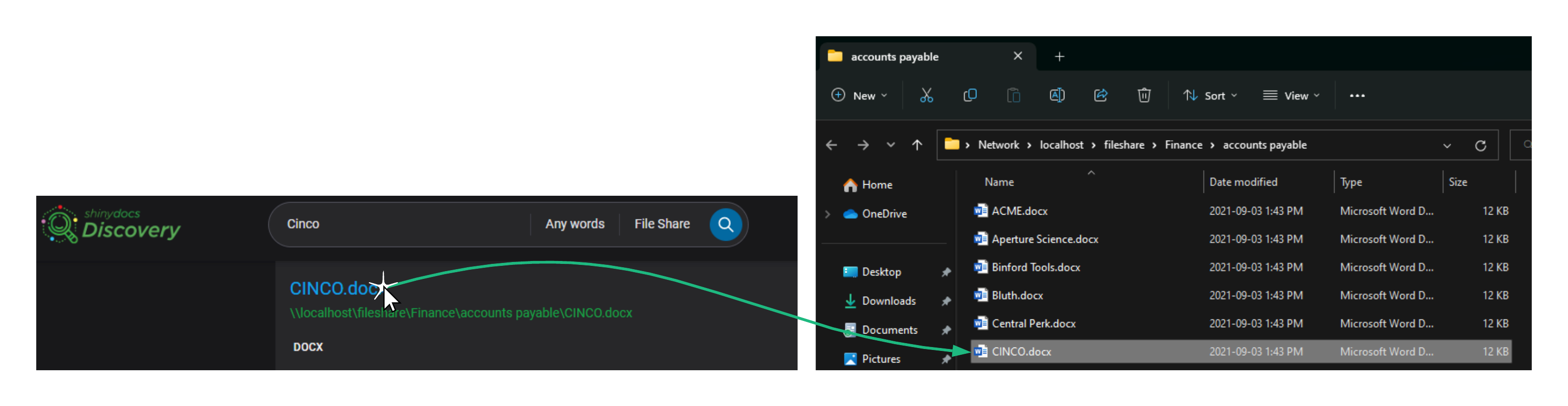 Shinydocs Protocol bridges Discovery Search and your file system, allowing Discovery Search users to open file system results in their native location. Discovery Search will automatically take users to the folder where the result lives and have it pre-selected.