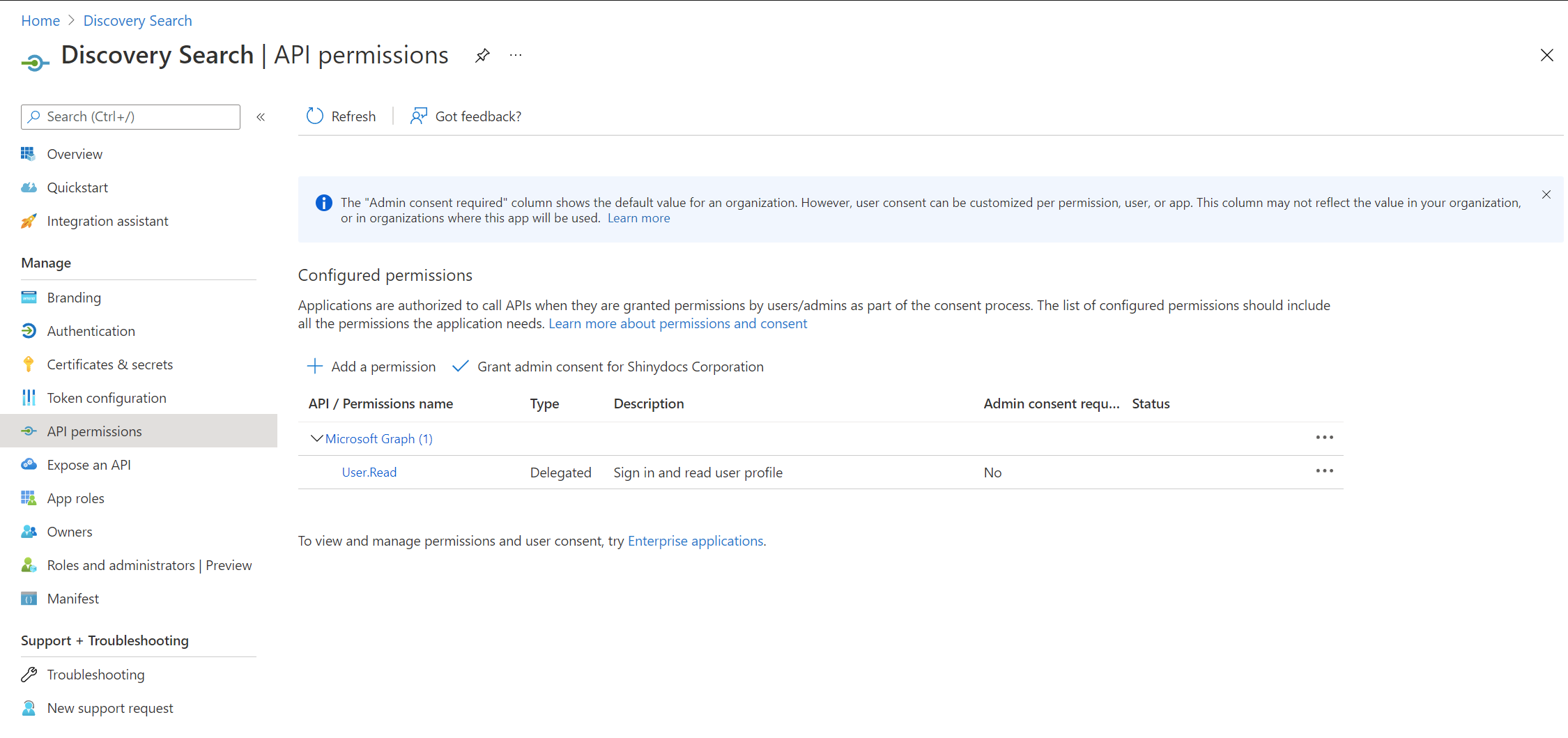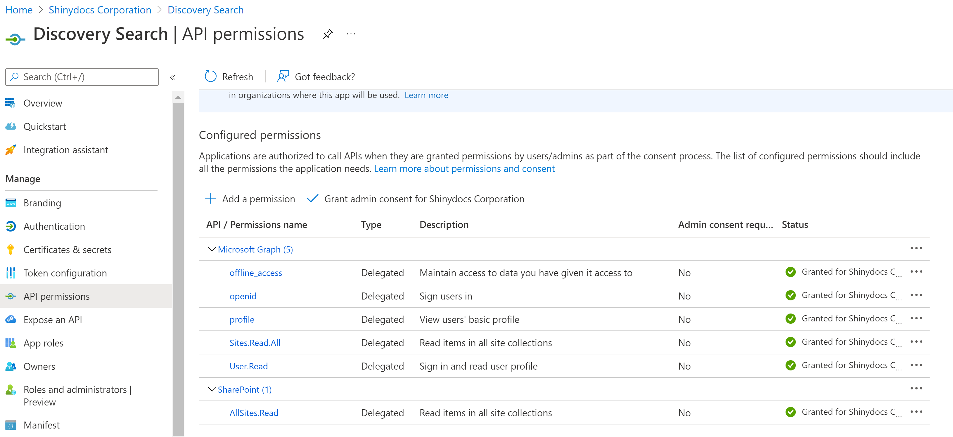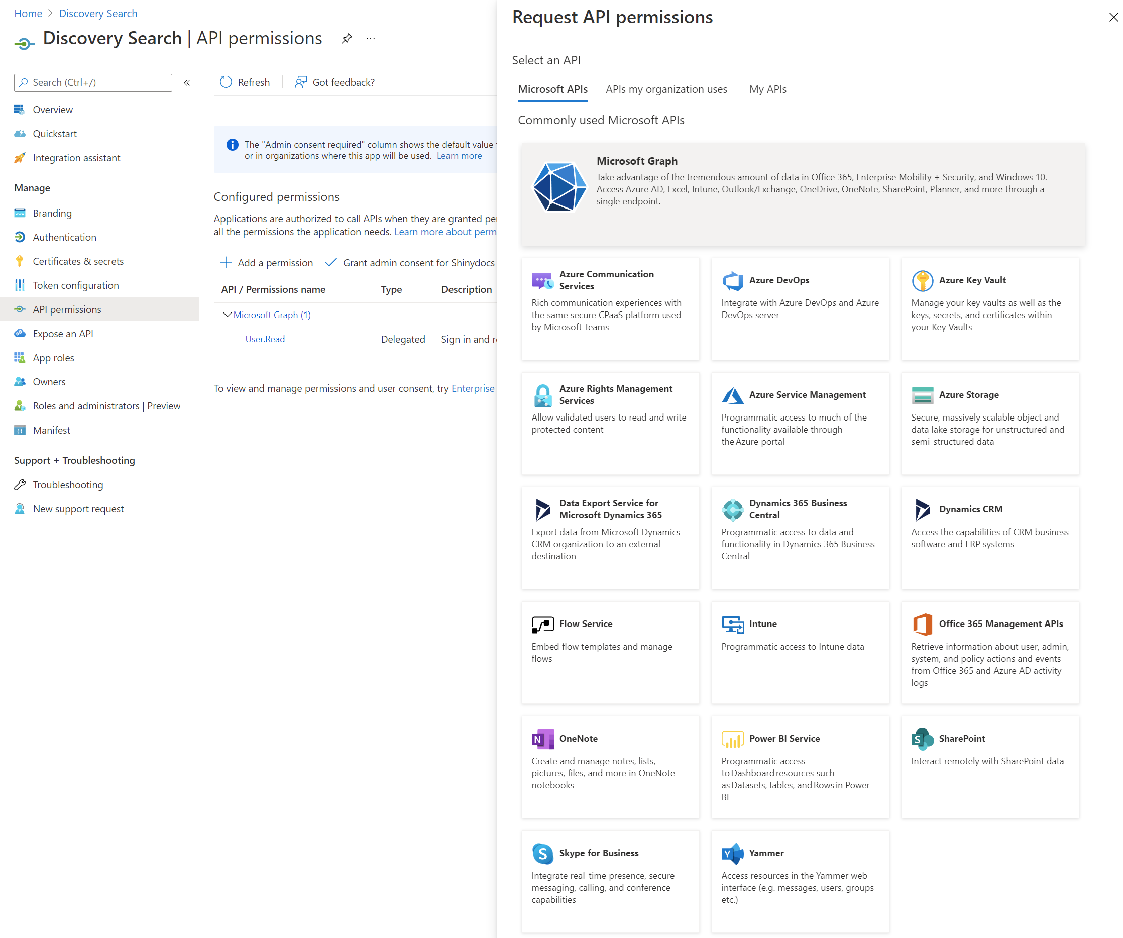 This section describes how to set up the appropriate API permissions for this application. This will allow Discovery Search to access SharePoint Online as the delegated user to do a permissions check.