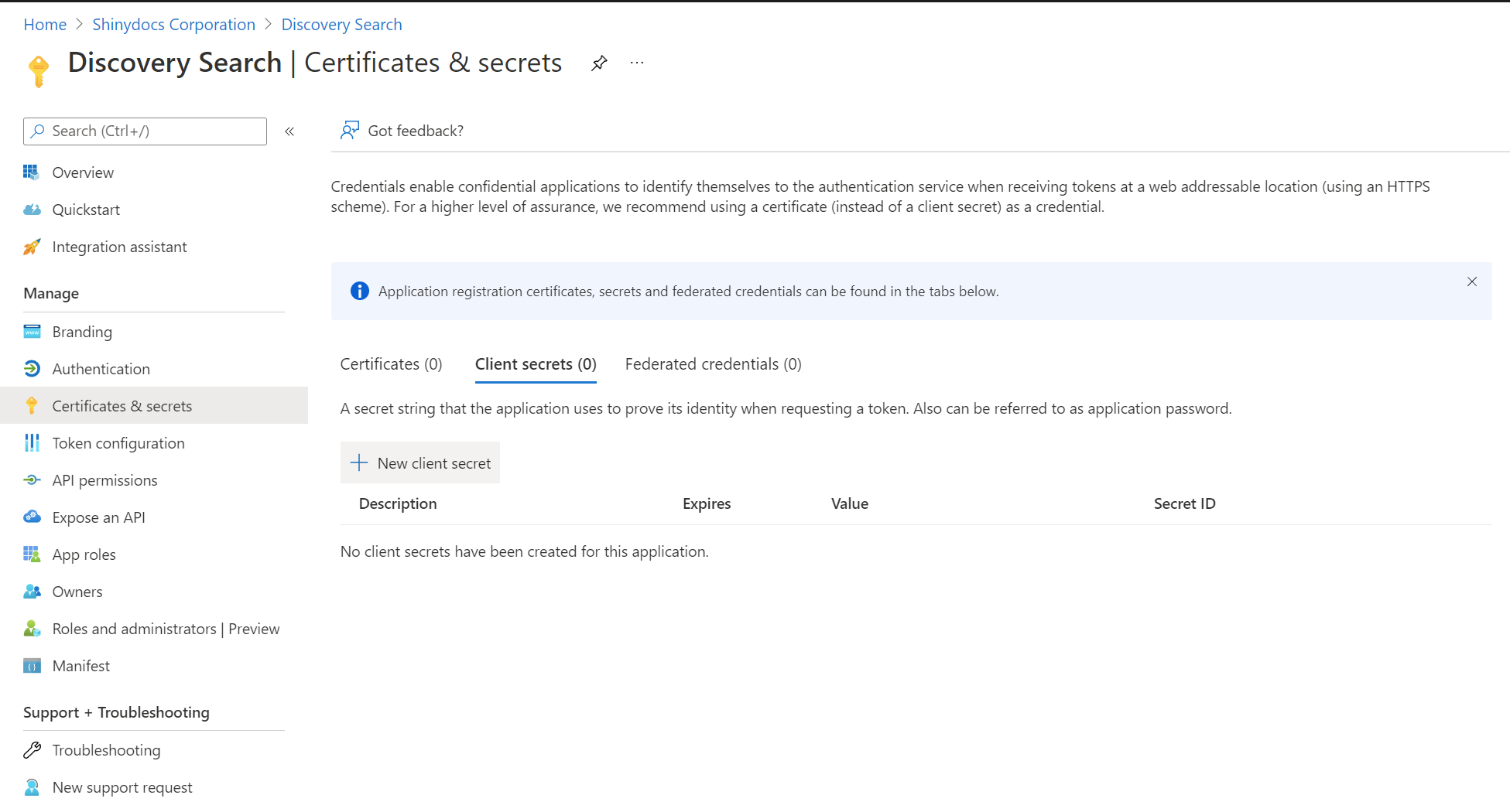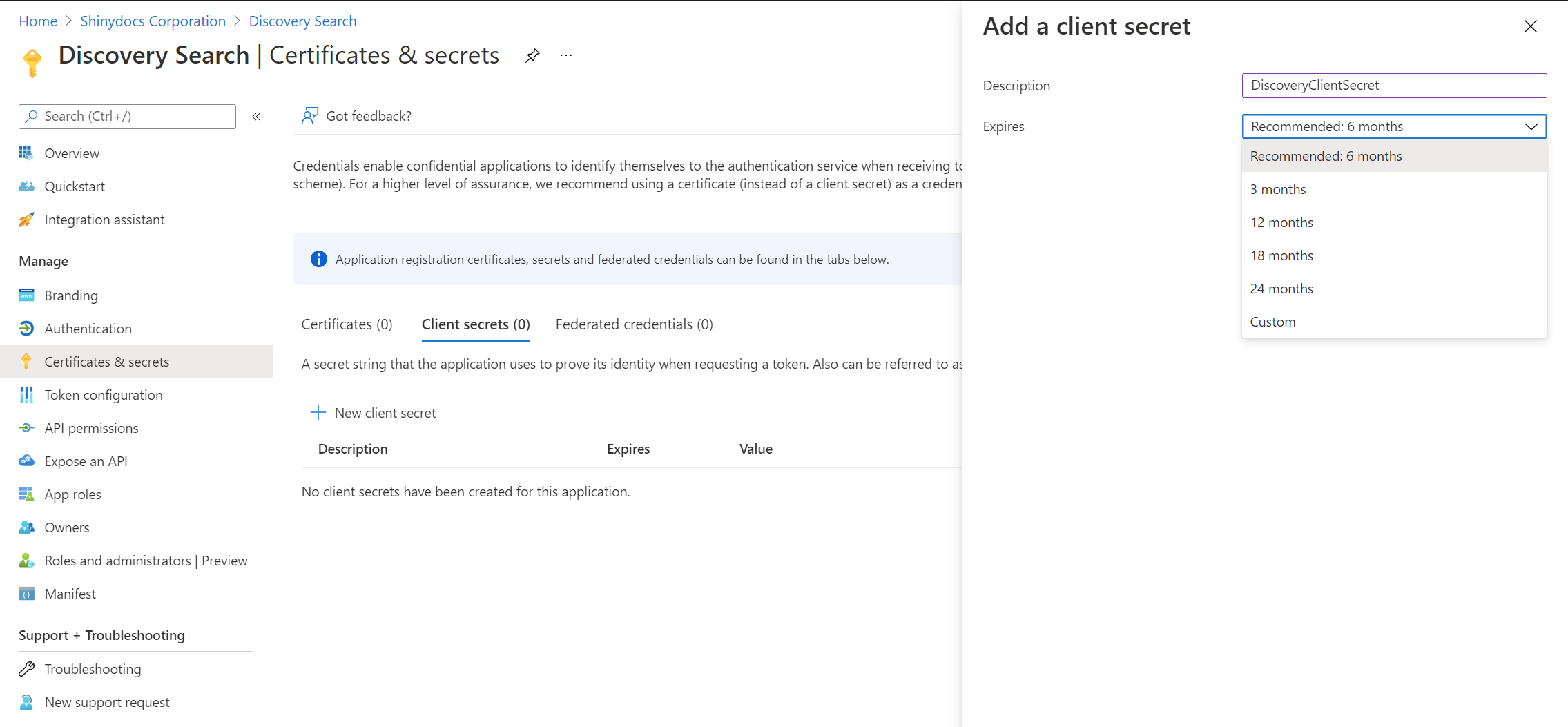 Expires: Provide how long the secret is valid. Note that, when it expires, the integration with Discovery Search stops working until a new secret is generated and updated in the Discovery Search web.config file
