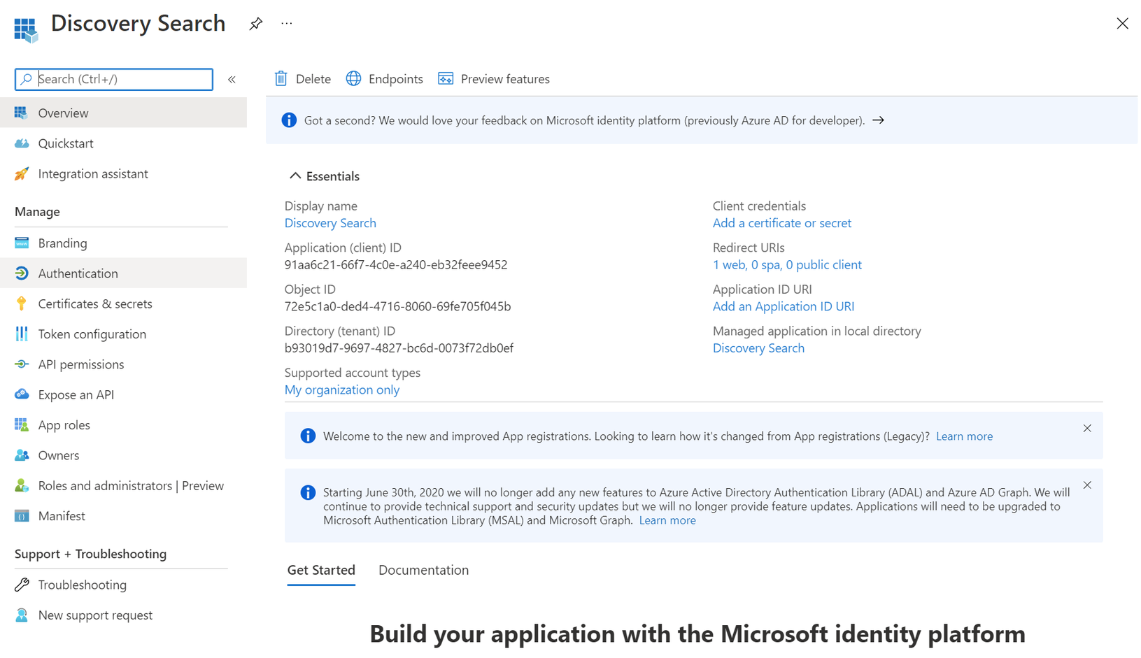 Before configuring Azure AD in Discovery Search, administrators must register and authenticate the Discovery Search app with the Azure Portal.