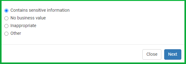 When the Report Document button is clicked, the user is prompted to record why this record should be hidden from view: