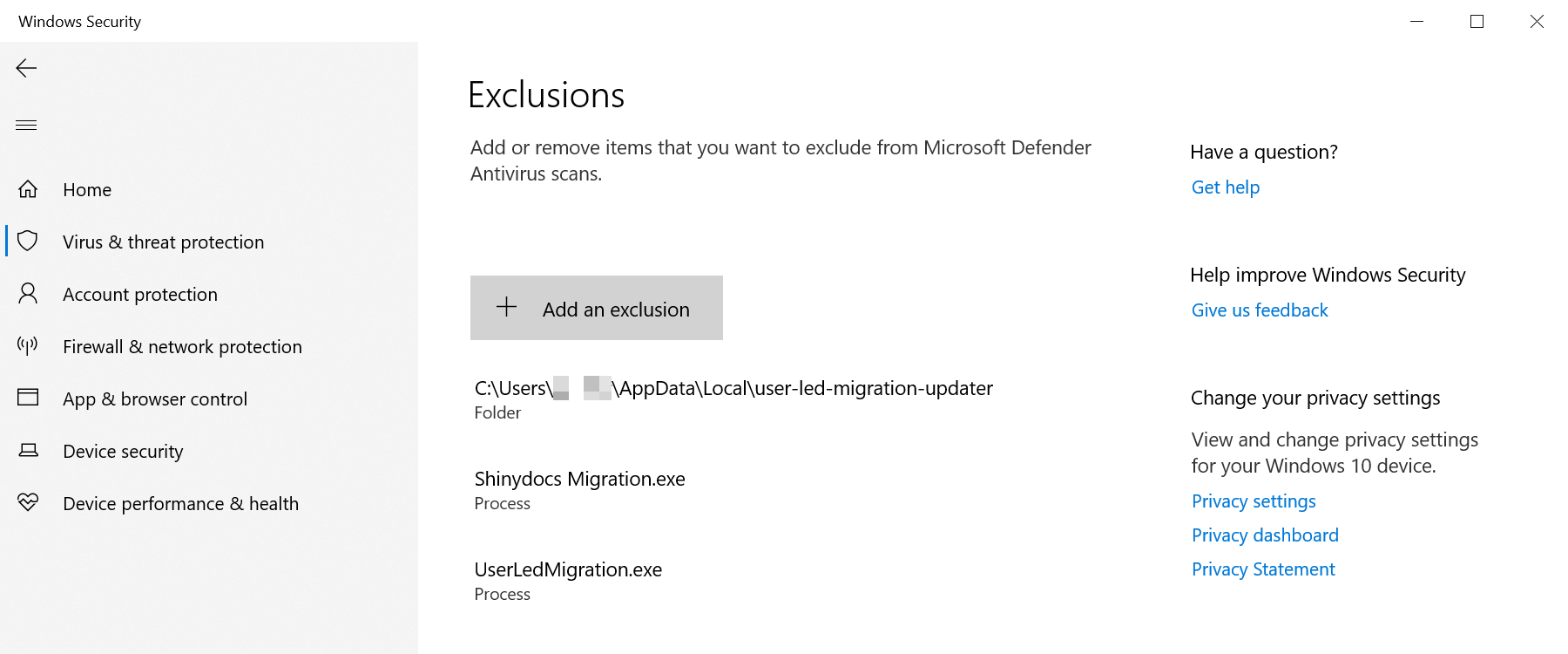 Add the following Microsoft Defender exclusions by navigating to Windows Security > Virus and Threat Protection > Manage Settings > Add or remove exclusions: