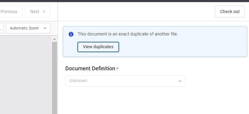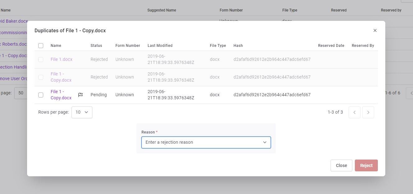 Review: Added an indicator on documents when duplicates have been detected. Users can now easily identify and be made aware of duplicates. A button on the indicator allows users to open a popup listing all duplicates where you can select one or more documents and bulk Reject the duplicates. There is also a prompt that allows a user to add a rejection reason to any rejected duplicates. Documents that have been put on hold by another user or that have been previously rejected will not apply to this workflow and must be removed from hold before they can be managed on this screen.