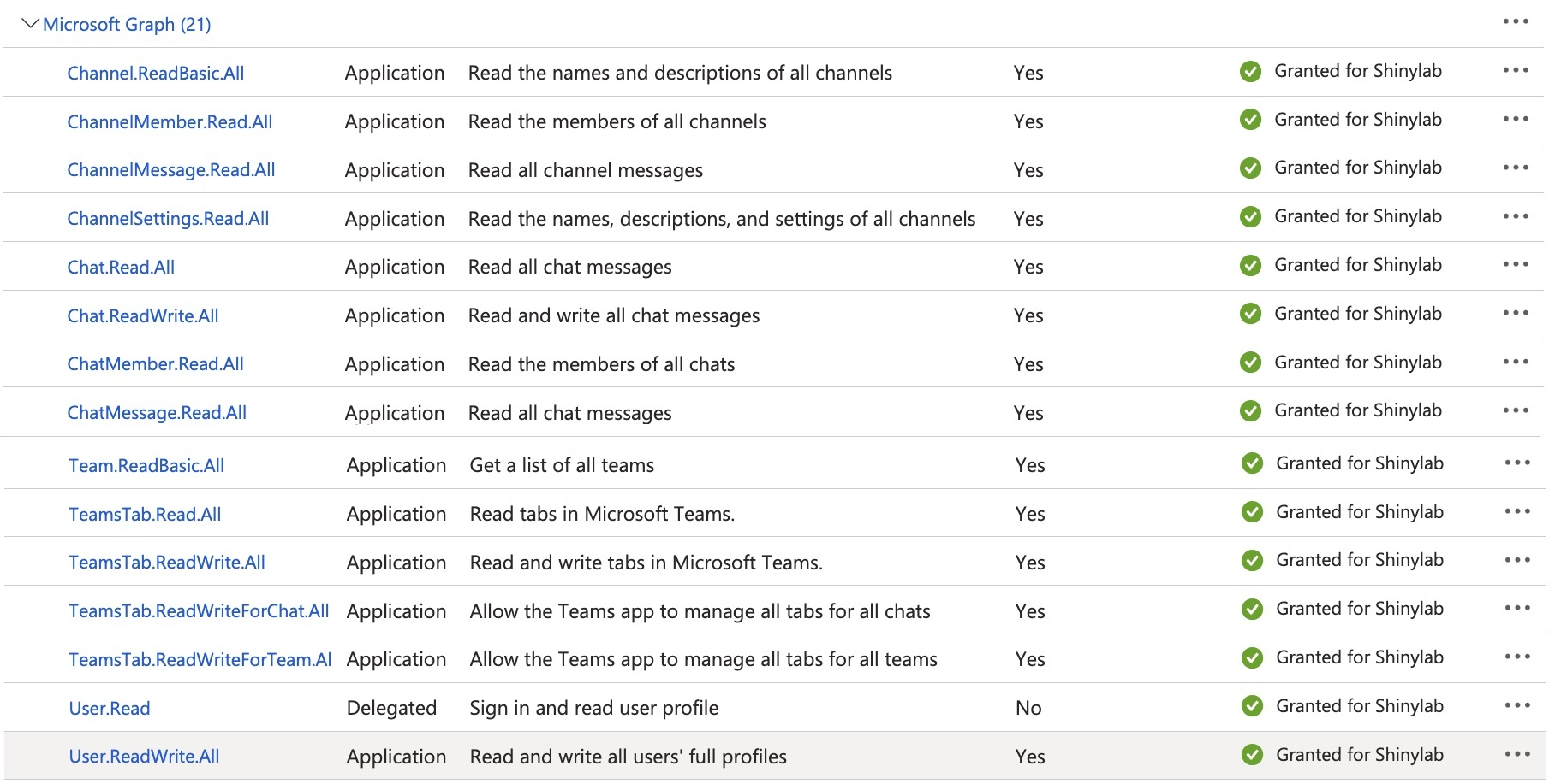 (Channel.ReadBasic.All, ChannelMember.Read.All, ChannelMessage.Read.All, ChannelSettings.Read.All, Chat.Read.All, Chat.ReadWrite.All, ChatMember.Read.All, ChatMessage.Read.All, Team.ReadBasic.All, TeamsTab.Read.All, TeamsTab.ReadWrite.All, TeamsTab.ReadWriteForChat.All, TeamsTab.ReadWriteForTeamAll, User.Read, UserReadWrite.All)