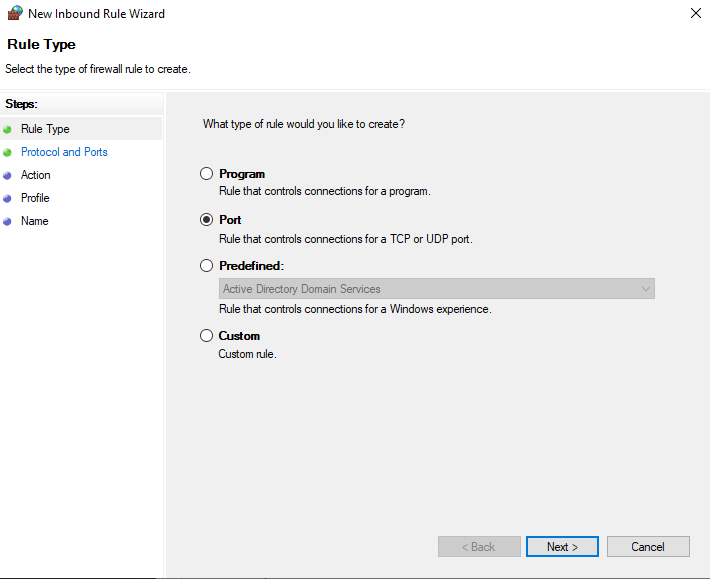 In the New Inbound Rule Wizard, select Port and click Next