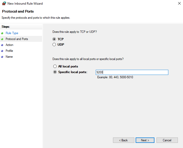 Select TCP and Specific local ports and enter 9200 (or the port you configured for the Indexer service), click Next