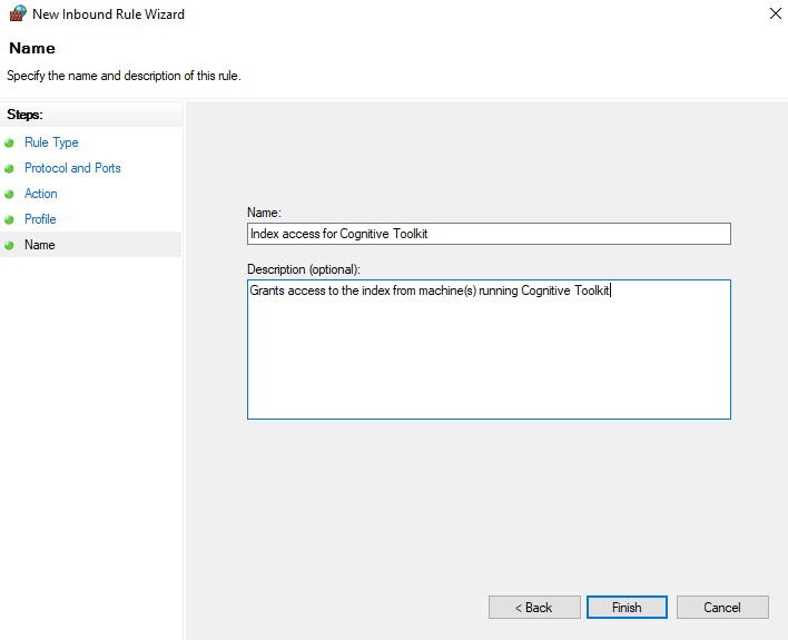 This will effectively block any access from external computers/users and only allow the set IP address source (Cognitive Toolkit server(s)) to communicate with the index on port 9200