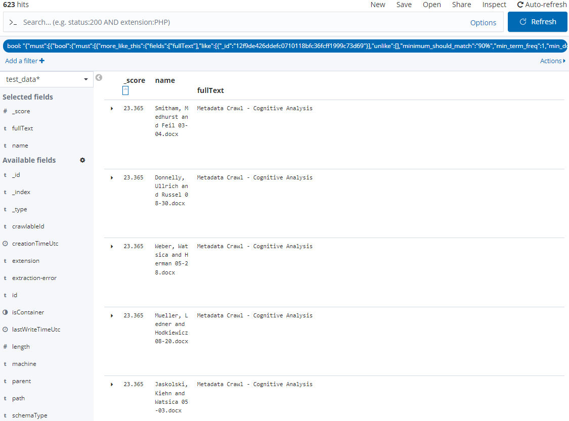 However, don't stop at the top results. Browse through to the bottom of your results to ensure there aren't any outlying documents being included unintentionally. You can achieve this by adding the _score field to the Discovery view and changing the sort direction. To make this process easier, consider also adding the name and fullText fields to the view.