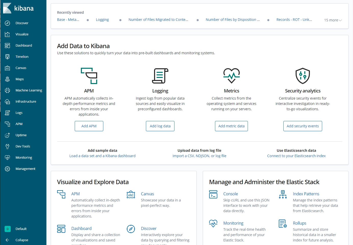 You will notice some new options in the left-side navigation pane. The same pages exist from previous versions, and also include Elasticsearch's other tools, however, they are not officially supported by Shinydocs at this time, including: