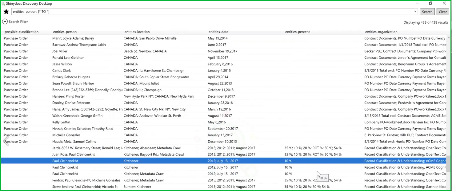 Discovery Desktop will display all the documents that have had a Person entity extracted. In this case, there were 438 matches using full text.