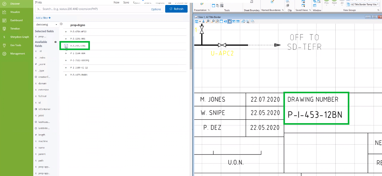 For example, in the following engineering drawing, Shinydocs MicroStation Add-in can automatically extract the Drawing Number (P-I-453-12BN) – or another data element within the drawing – and add it to the index where: