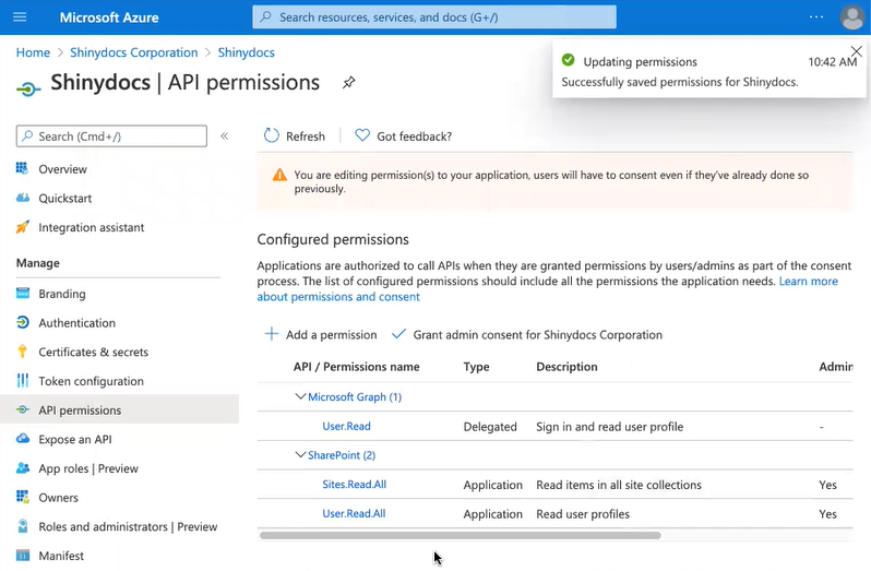 Now that the Shinydocs Application has been registered with Azure, it’s time to apply permissions to access content within SharePoint.