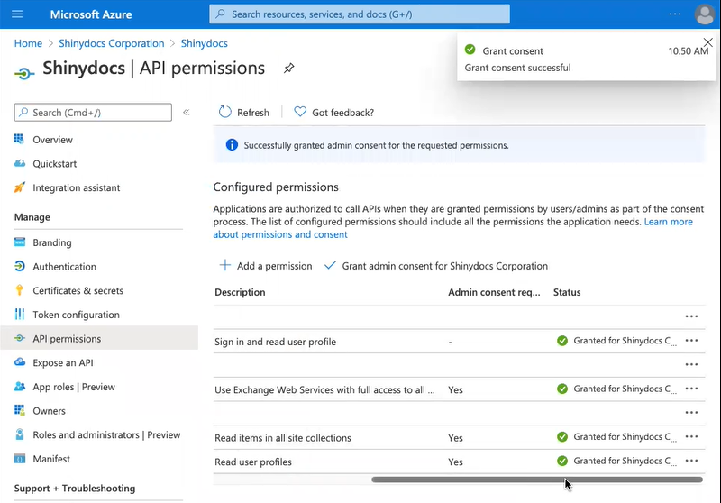 At the top of the page, there will be a notification that admin consent for the requested permissions was successfully granted.