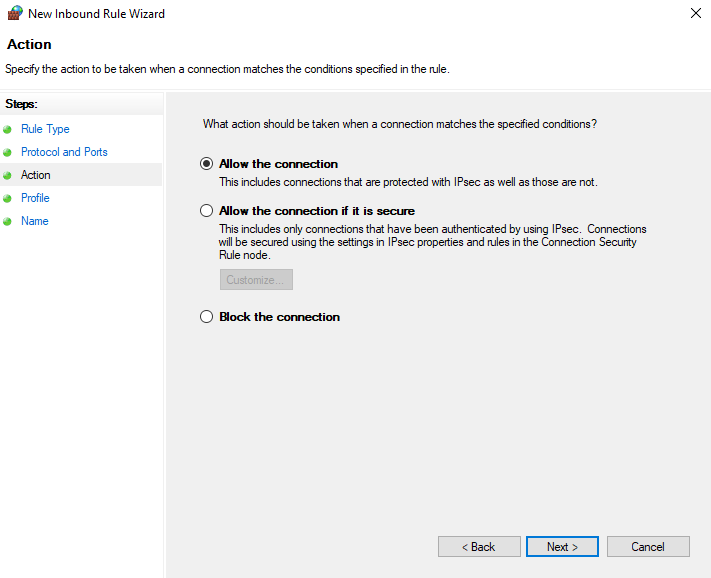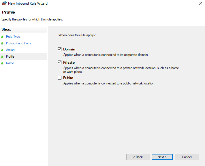Select Domain and Private (meaning this rule would not apply on a public connection, where all access should be blocked by your existing firewall rules), click Next