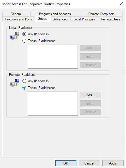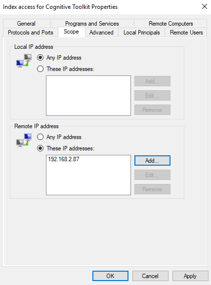 In the new window, select the Scope tab. Under Remote IP Address select These IP addresses and click Add