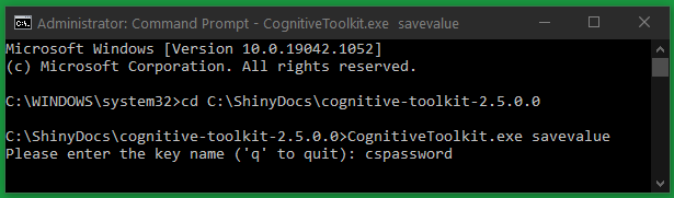 CODECognitiveToolkit.exe savevalueYou will be prompted to enter the key name. They key name is used to identify what value you are going to encrypt such as a Content Server Password. For example: we used the key name cspassword