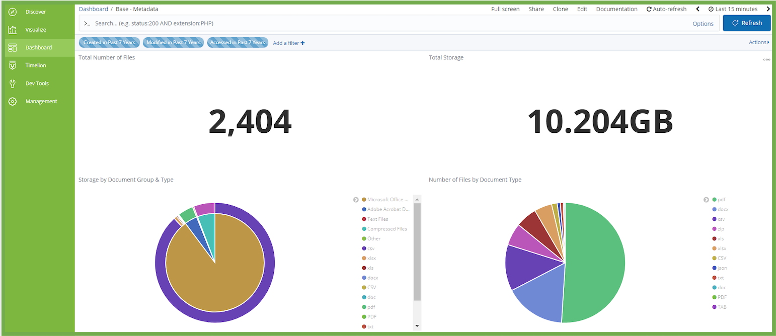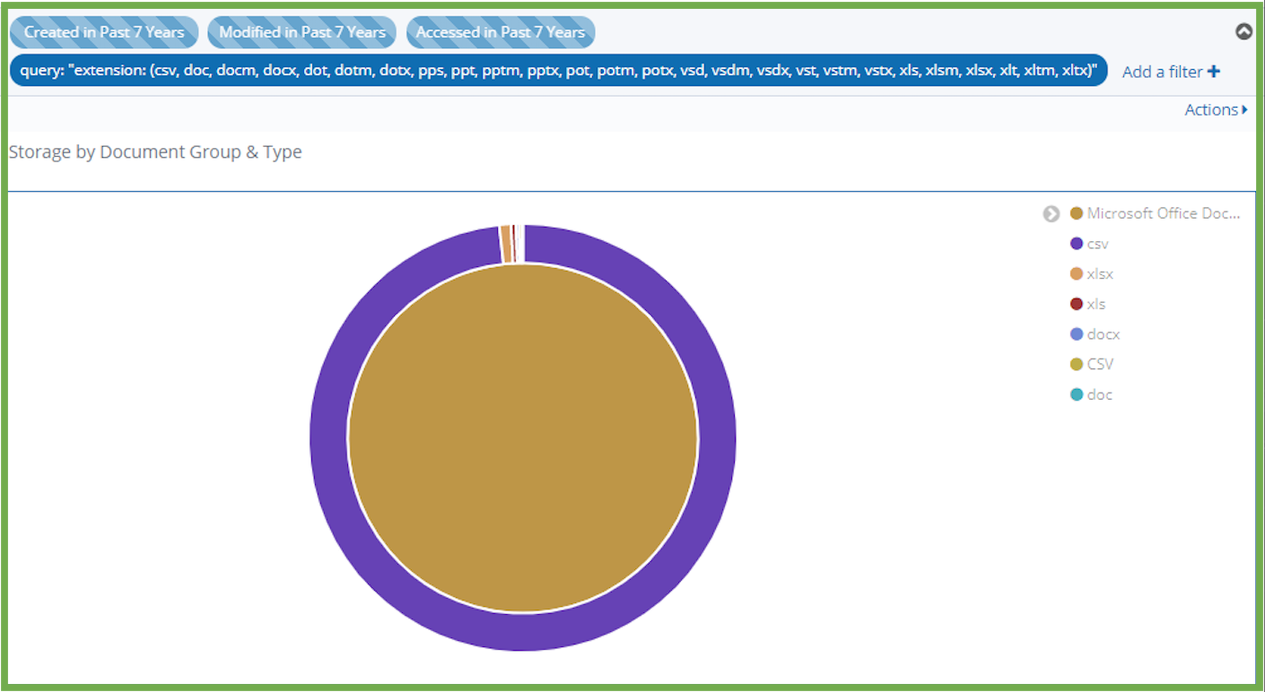 Number of Files by Document Type This pie chart lists (by file extension) the 500 files found in the Shinydocs Index using the largest amounts of storage. | Check for file extensions that are no longer used. Check for files, by file extension, that are taking up an abnormally high amount of storage. *To investigate further, use filters to drill into this data. | Classify as ROT