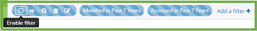 To enable a filter, use the cursor to hover over it. For example, hover over the Created in Past 7 years filter. Click Enable filter.