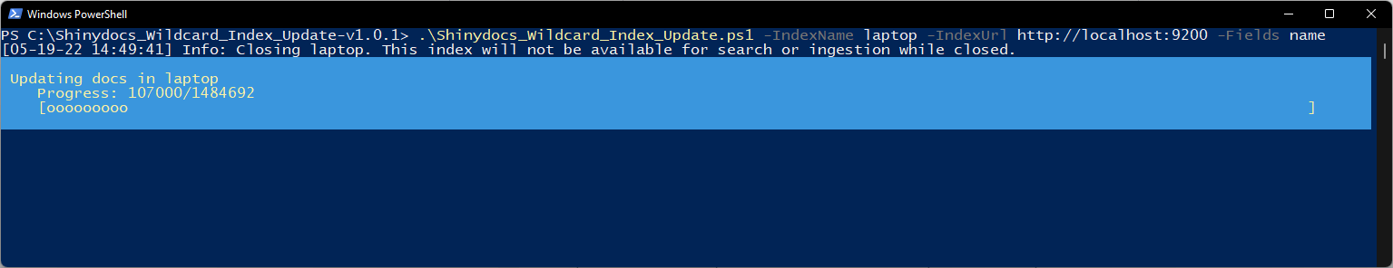 ExamplePOWERSHELL.\Shinydocs_Wildcard_Index_Update.ps1 -IndexName shinyIndex -IndexUrl http://localhost:9200 -Fields nameWhile running, the console will display the progress along with information about the step it is on