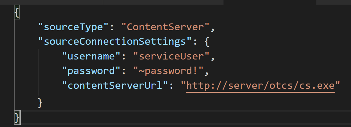 AuthenticationtypeisContentServerUsernameAndPassword:CsUsername-username of the user connecting to content server (if the same user has access, it may not need to be changed)CsPassword- password for the user connecting to content server (if the same user has access, it may not need to be changed)