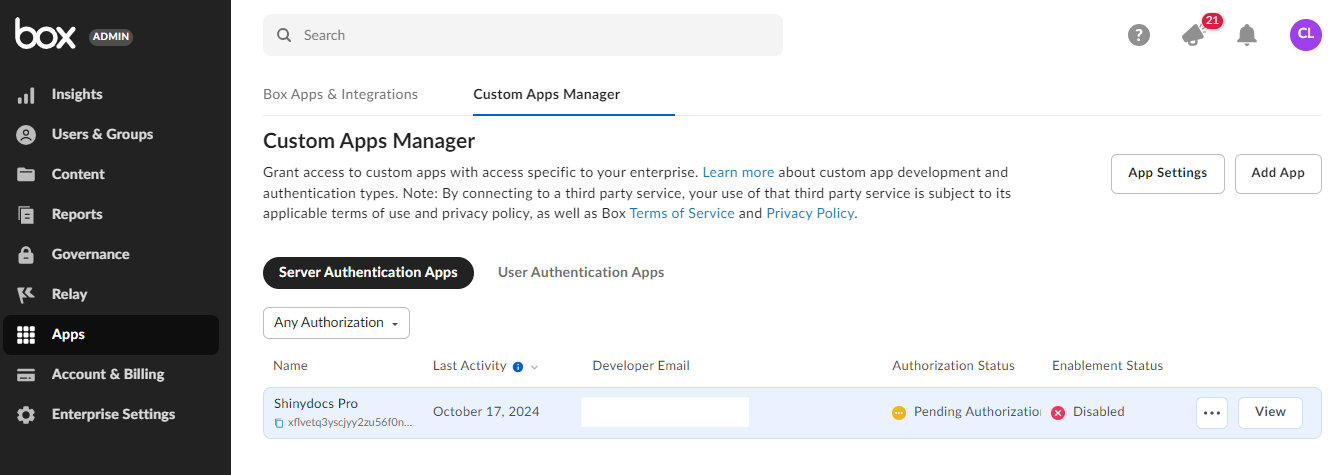 To analyze content from your organization's Box repository, you will need to create a new application in your Box tenant for Shinydocs Pro. This guide will show you how to add the application and get the following details required for Shinydocs Pro to connect to Box: