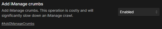 By default, iManage does not provide path information (crumbs) when gathering information about your iManage content. We have a new feature in early access that will allow Shinydocs Pro to get the crumbs from iManage during the Crawling content step. To enable this feature: