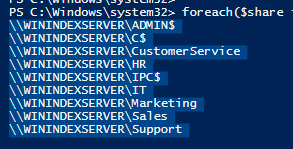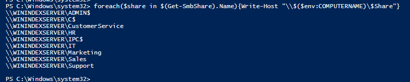 foreach($share in $(Get-SmbShare).Name| Where-Object {$_ -notlike "*$*"}){Write-Host "\\$($env:COMPUTERNAME)\$Share"}