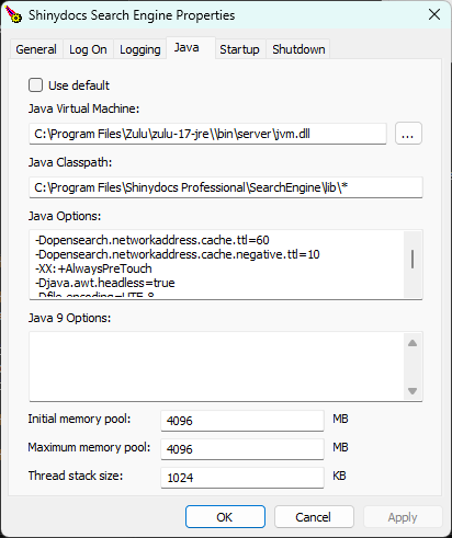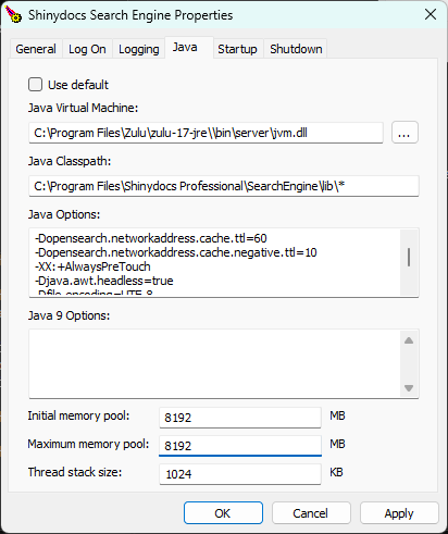 The way to change it when running as a service to run the following from an administrative command prompt from the bin directory of the OpenSearch install.opensearch-service-mgr.exe //ES//shinydocs-search-engine