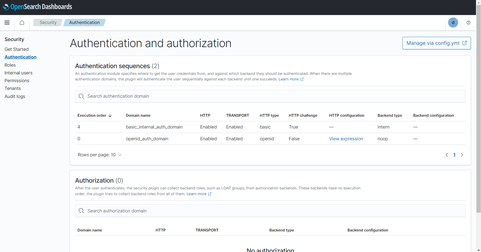 CODEC:\opensearch\opensearch\plugins\opensearch-security\tools\securityadmin.bat -f C:\opensearch\opensearch\config\opensearch-security\config.yml -t config -icl -nhnv -cacert C:\opensearch\opensearch\config\root-ca.pem -cert C:\opensearch\opensearch\config\kirk.pem -key C:\opensearch\opensearch\config\kirk-key.pemYou can confirm the changes in the security tab in OpenSeach Dashboards under Security → Authentication. You should be able to see the openid_auth_domain entry in the list. If it is not there, it is not applied.