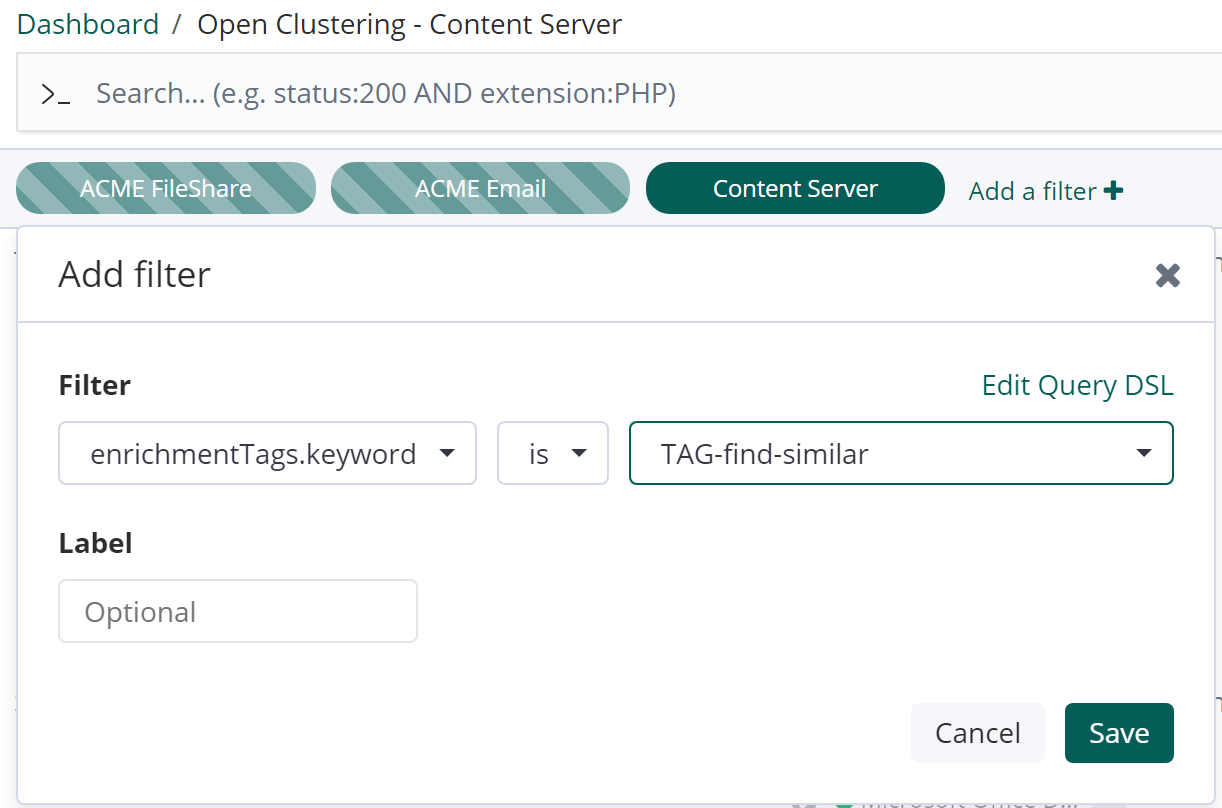 Assuming this has already been set up by your Administrator, open the Open Clustering Dashboard and add a filter for enrichmentTags.keyword is [your enrichment tag]