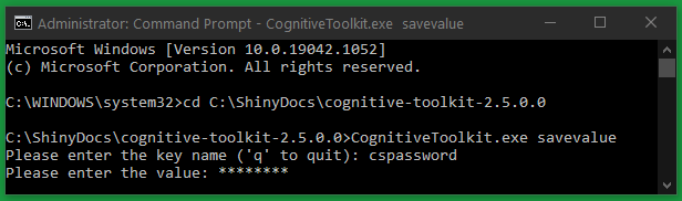 CODECognitiveToolkit.exe savevalueYou will be prompted to enter the key name. They key name is used to identify what value you are going to encrypt such as a Content Server Password. For example: we used the key name cspassword