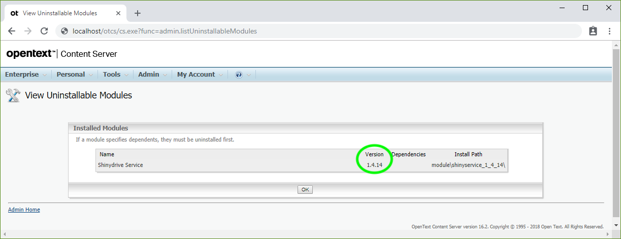 Shinydrive Service should be listed as an Installed Module along with its Version #