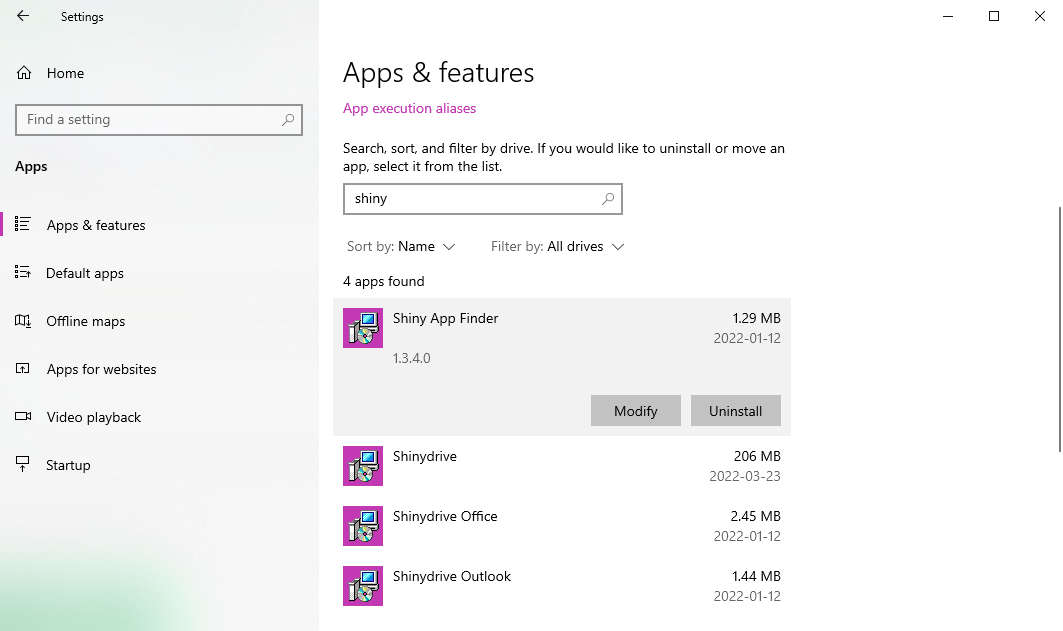 When updating Shinydrive, it’s important to ensure that you always have the most recent version of each component installed. The simplest method to review the versions of most Shinydrive Components (Shinydrive Windows Client, Shiny App Finder, Shinydrive Outlook and Office plug-in, and the Windows Driver) is through the Apps & Features page within Windows Settings.